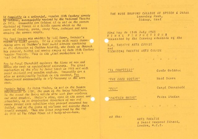 Yvonne returned to Rose Bruford to direct students in College productions, including a production of The Good Doctor by Neil Simon in 1985, in which our present Programme Director of BA Actor Musicianship Alison MacKinnon starred.
